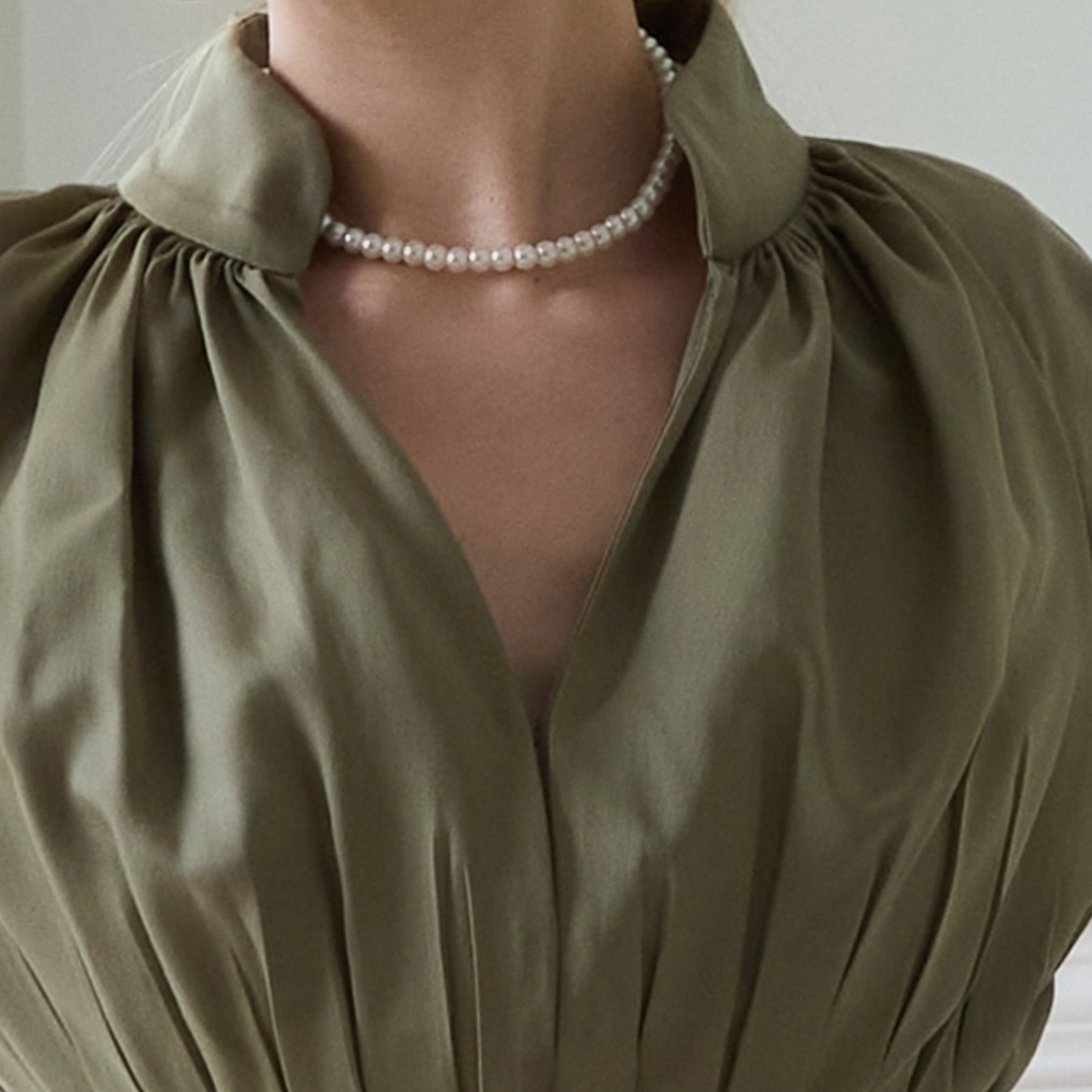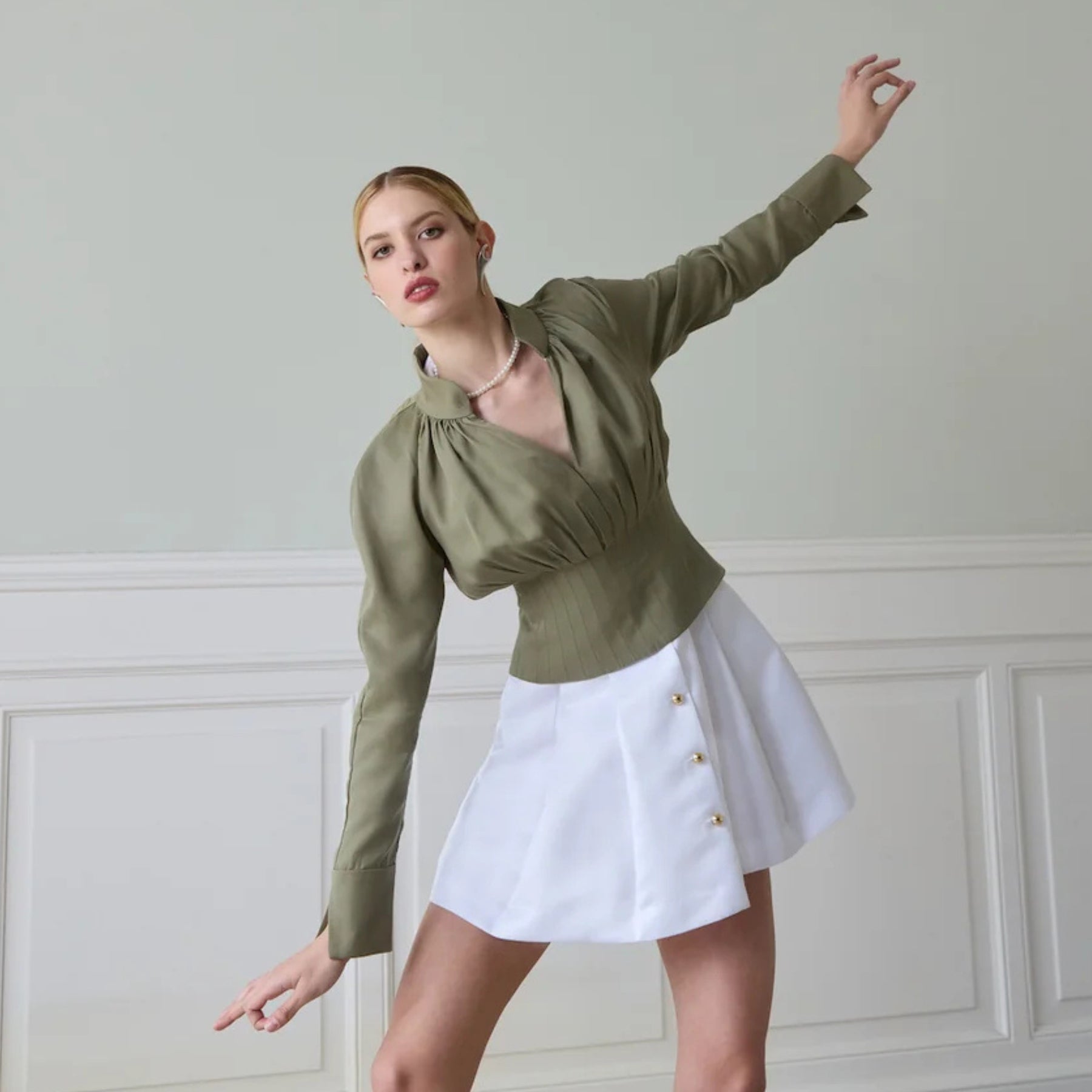 Ce top élégamment ajusté est conçu en tencel d'une finesse remarquable. Chaque pli, méticuleusement disposé aux épaules et le long du buste, structure le vêtement avec subtilité, épousant les courbes avec une grâce naturelle. Les manches de style kimono s'étendent en douceur pour se terminer en des fentes raffinées aux poignets, accentuant la délicatesse du design. Le col montant, qui rejoint une échancrure en V, est doté d'un bouton délicat permettant d'ajuster la profondeur du décolleté, offrant une personnalisation élégante à la silhouette.
